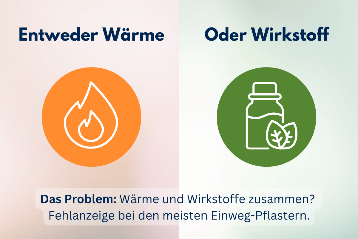 Das Problem: Verbraucher müssen sich entscheiden – entweder Wärme oder Wirkstoffe. Beides zusammen? Fehlanzeige bei den meisten Einweg-Pflastern.