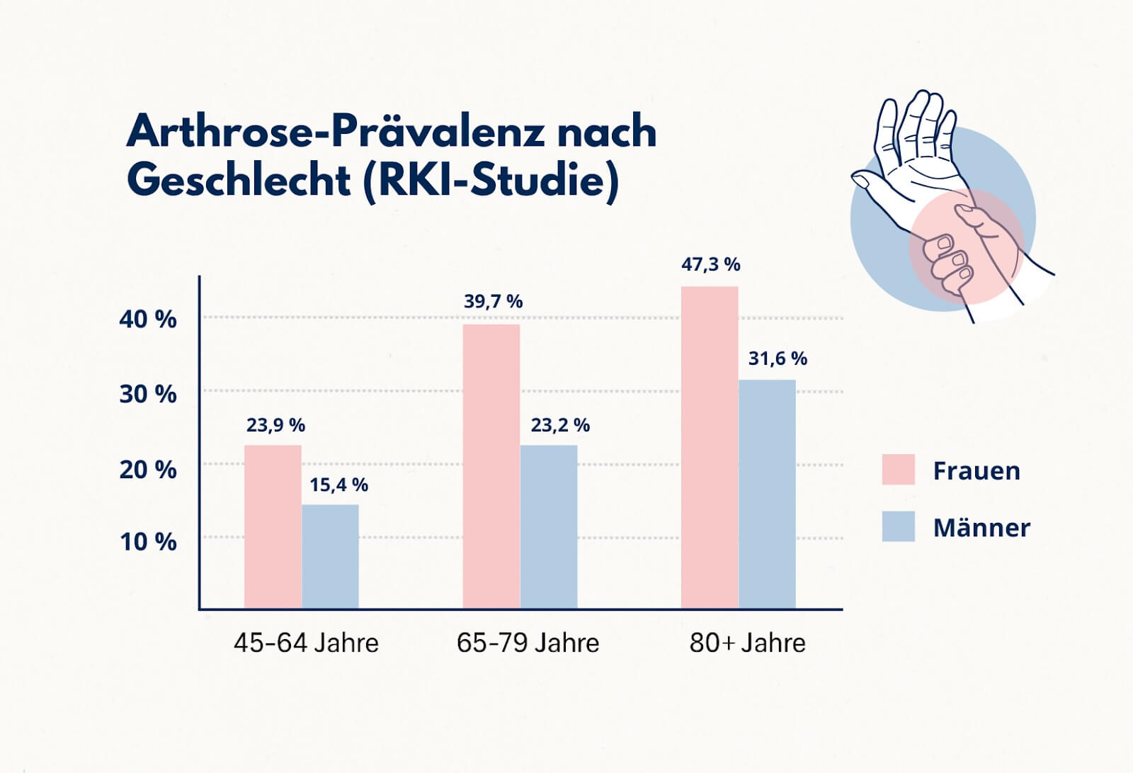Die offiziellen Zahlen des Robert Koch-Instituts sind alarmierend: 21,6% aller deutschen Frauen leiden unter Arthrose - bei Männern sind es nur 12,4%.