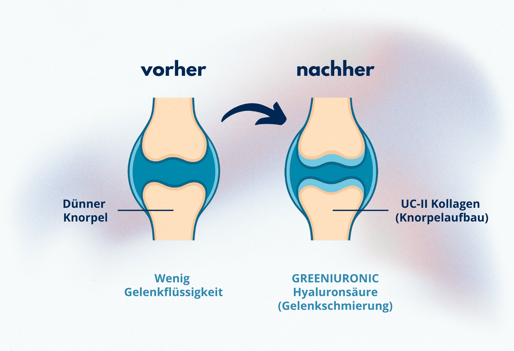 Die patentierte Kombination beider Wirkstoffe sorgt dafür, dass Sie durch die Hyaluronsäure sofort wieder beweglicher sind, während das Kollagen langfristig die Gelenkstruktur wieder aufbaut.